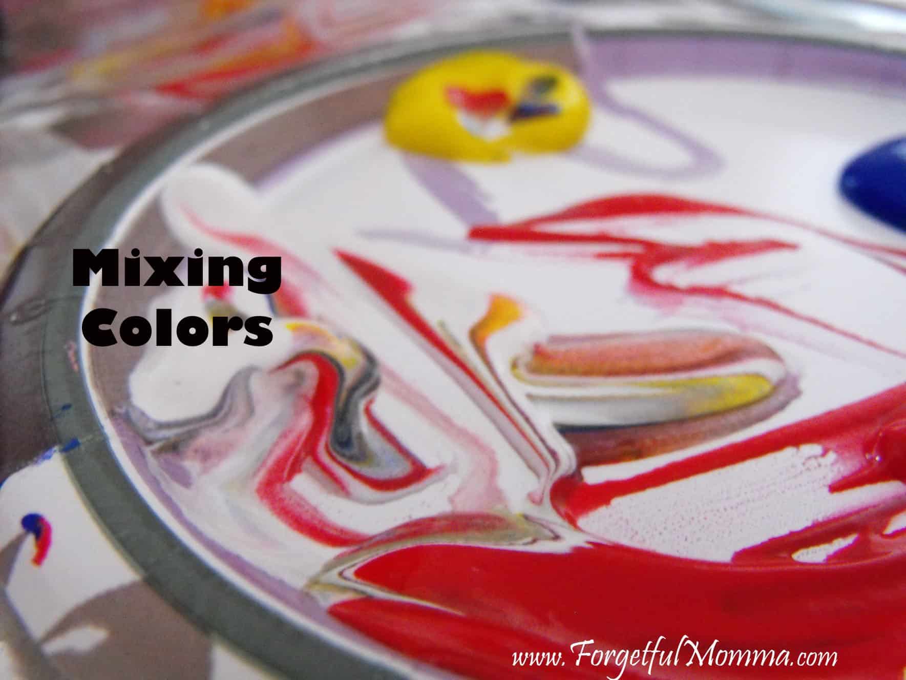 We mixed our primary colors to see what we got. In the end they saw how to make brown: mix it all together!