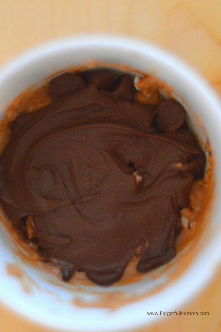 - Microwave for 45 second to a minute. Once the chocolate chips are melted, spread evenly over the peanut butter and then freeze for about 15 minutes.