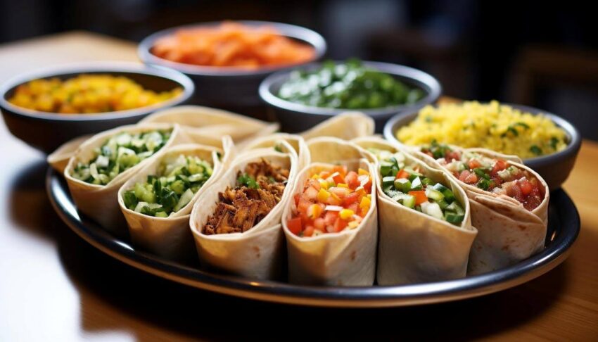 Warm rotis and fold lightly to form taco shells. Fill with rajma or paneer stuffing, add lettuce and cheese, drizzle sauce, and pack carefully so the shape holds.